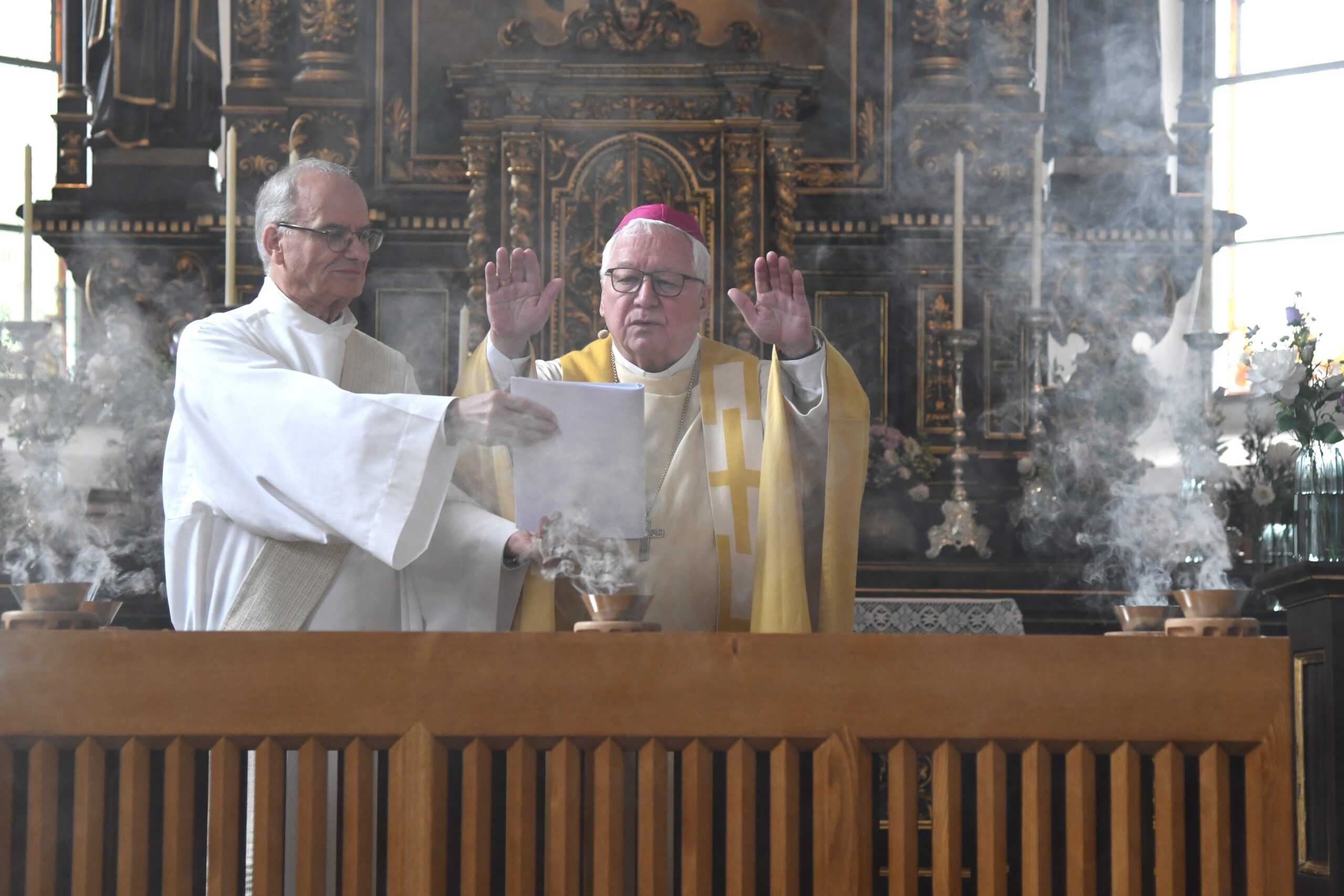 «In dieser wunderbar renovierten Klosterkirche wird sichtbar dargestellt, dass Gott gegenwärtig ist in dieser Welt», sagte Bischof Markus Büchel mit grosser Freude anlässlich des Einweihungsgottesdienstes mit Altarweihe gestern Samstag, 4. Mai 2024. Mitglieder des Vereins Kloster Maria Rosengarten Wonnenstein sowie Gäste aus Kirche und Politik waren gekommen, um den gelungenen Abschluss der zweijährigen Bauphase zu feiern.