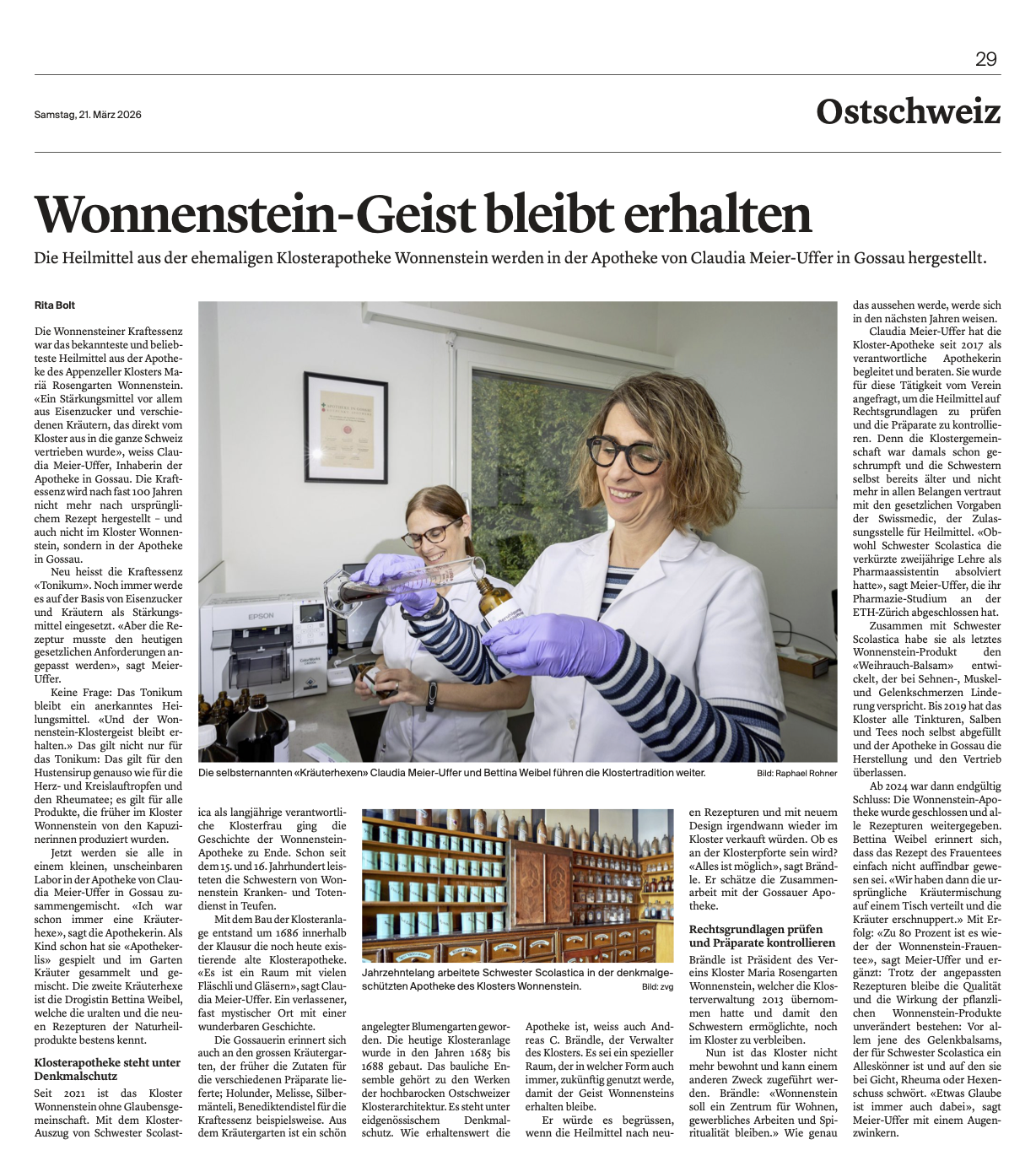 Der Verein Kloster Wonnenstein freut sich über die gelungene Erneuerung der Klosterprodukte und die erfolgreiche Zusammenarbeit mit der Apotheke in Gossau.